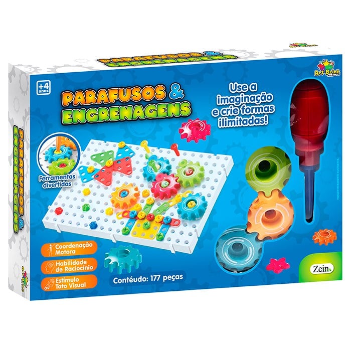 A base perfurada funciona como bancada de montagem, permitindo criar infinitas combinações com segurança e facilidade. Além de entreter, o brinquedo também contribui para o desenvolvimento pedagógico e sensorial dos pequenos.