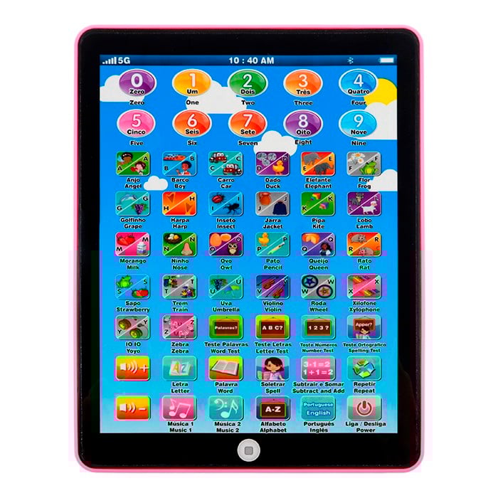 O Tablet Interativo Bilíngue Infantil é um brinquedo educativo que une aprendizado e diversão! Com design moderno e tela cheia de ícones coloridos, ele ajuda as crianças a aprenderem números, letras, palavras e músicas em português e inglês, estimulando o desenvolvimento bilíngue desde cedo.